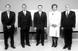 Andrés Manuel López Obrador, Jesús Silva Herzog, Santiago Creel, Tere Vale y Alejandro Ordorica momentos antes de la confrontación