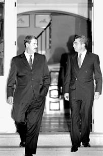 Vicente Fox y Ernesto Zedillo luego de la reunión que sostuvieron ayer en la residencia presidencial Ť Foto: José Antonio López