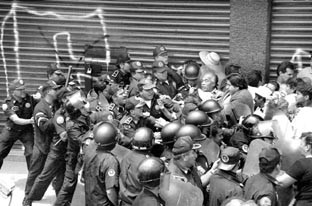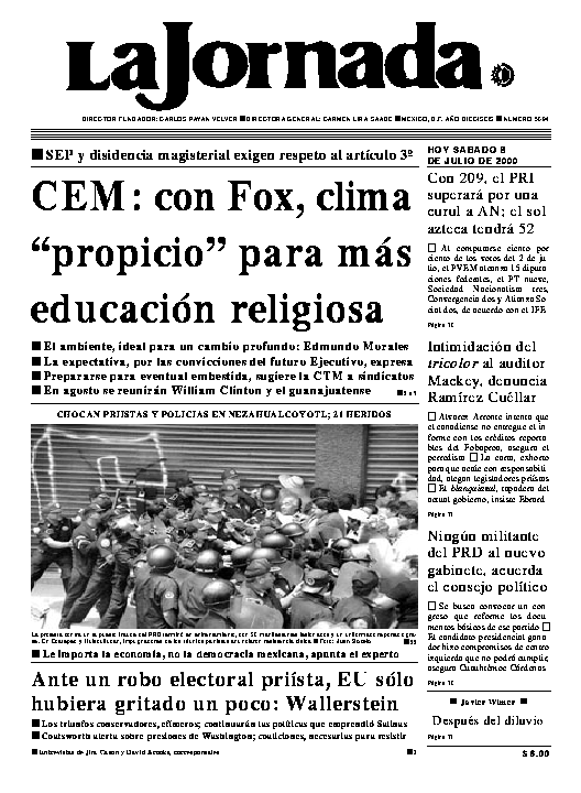 La protesta contra un supuesto fraude del PRD terminó en enfrentamiento, con 20 manifestantes lesionados y un uniformado reportado grave. En Ecatepec y Huixquilucan, impugnadores de los triunfos panistas anunciaron resistencia cívica Ť Foto: Juan Sotelo