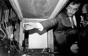 El procurador de Oaxaca, Sergio Santibáñez, muestra uno de los tres micrófonos encontrados en el Palacio de Gobierno y en la residencia oficial. El mandatario estatal dijo saber que colaboradores de su antecesor, Diódoro Carrasco, se han dedicado a este tipo de actividades. Ante las alusiones, la Secretaría de Gobernación se deslindó de cualquier acto de espionaje en ese estado Ť Foto: Ezequiel Leyva