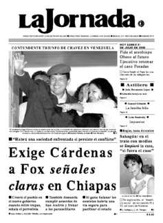El mandatario Hugo Chávez celebra la victoria junto con su hija en un balcón del palacio presidencial, tras obtener casi 60 por ciento de los sufragios. En el duelo entre ex militares, su adversario, Francisco Arias, acumulaba poco más de un tercio de la votación. La jornada electoral se desarrolló prácticamente sin incidentes graves Ť Josetxo Zaldúa, enviado Ť Foto: Reuters