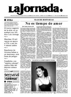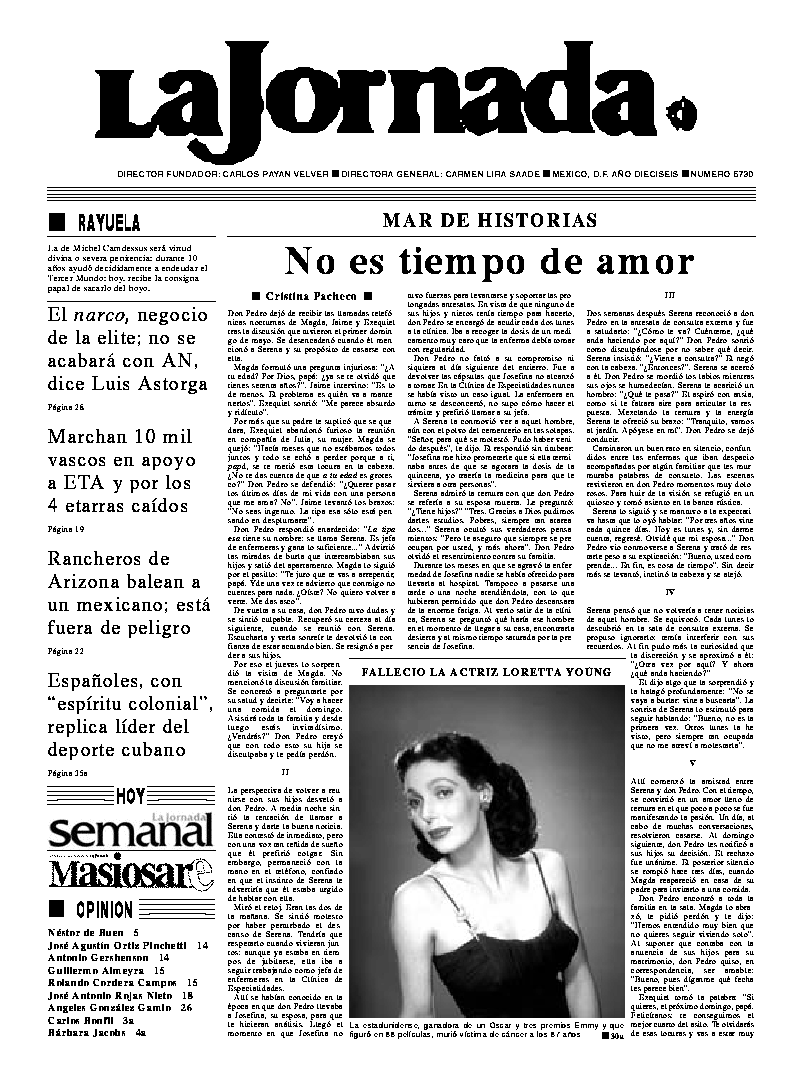 MAR DE HISTORIAS Ť Cristina Pacheco No es tiempo de amor FALLECIO LA ACTRIZ LORETTA YOUNG El narco, negocio de la elite; no se acabará con AN, dice Luis Astorga Marchan 10 mil vascos en apoyo a ETA y por los 4 etarras caídos Rancheros de Arizona balean a un mexicano; está fuera de peligro Españoles, con ``espíritu colonial'', replica líder del deporte cubano