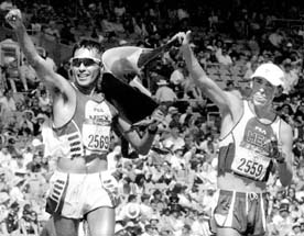 Festejos de Bernardo Segura (izquierda) antes de su controvertida descalificación en la prueba de caminata de 20 kilómetros, tras cruzar la meta en primer lugar. La delegación mexicana en Sydney presentó una protesta, pero la medalla de oro fue otorgada al polaco Robert Korzeniowski, la de plata al mexicano Noé Hernández y la de bronce al ruso Vladimir Andreiev Ť Foto: Reuters