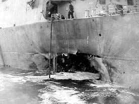 Un boquete de seis por 12 metros provocó un poderoso estallido en el sofisticado destructor USS Cole de la marina estadunidense, cuando cargaba combustible en el puerto yemenita de Adén. Los informes señalan que la explosión sobrevino cuando dos hombres se colocaron en una balsa de goma al lado de la nave Ť Foto: Reuters