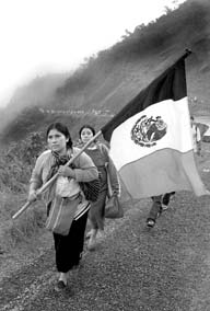 Con el estandarte de la Virgen de Guadalupe y la bandera nacional, unos 250 indígenas de diferentes etnias chiapanecas comenzaron su marcha hacia la ciudad de México para ``contribuir a la construcción de la justicia y la paz justa y digna'' Ť Foto: Ap /Eduardo Verdugo