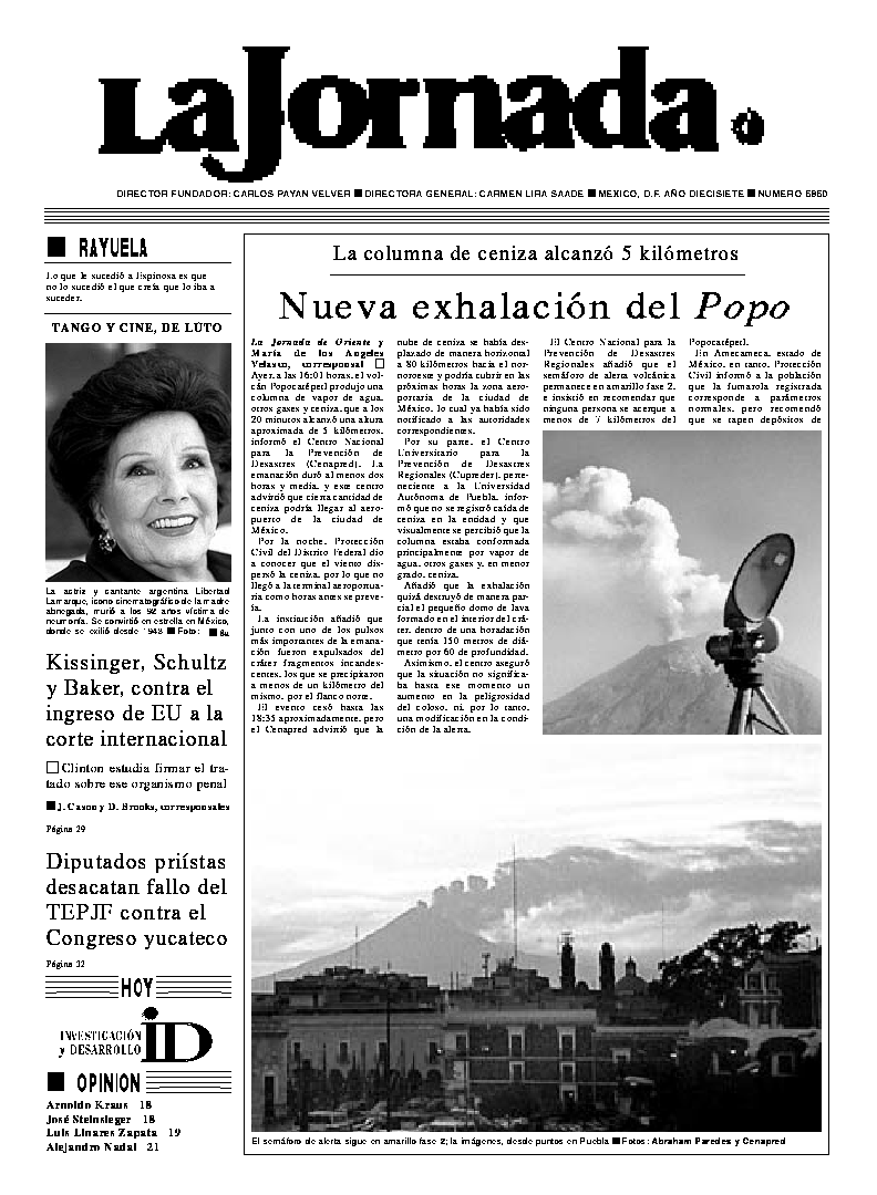 La Jornada, Coordinación de Sistemas Francisco Petrarca 118, Col. Chapultepec Morales, delegación Miguel Hidalgo México D.F. C.P. 11570 Teléfono (525) 262-43-00, FAX (525) 262-43-56 y 262-43-54
