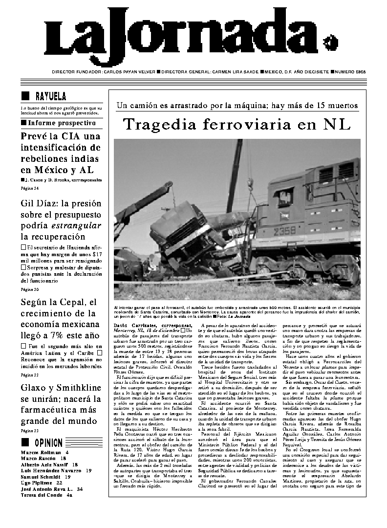 La Jornada, Coordinación de Sistemas Francisco Petrarca 118, Col. Chapultepec Morales, delegación Miguel Hidalgo México D.F. C.P. 11570 Teléfono (525) 262-43-00, FAX (525) 262-43-56 y 262-43-54