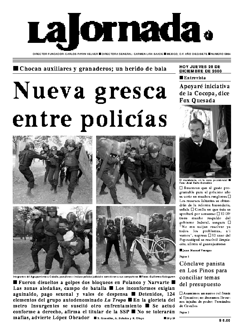 Fueron disueltos a golpes dos bloqueos en Polanco y Narvarte Las zonas aledañas, campo de batalla Los inconformes exigían aguinaldo, pago sexenal y vales de despensa Detenidos, 124 elementos del grupo autodenominado La Tropa En la glorieta del metro Insurgentes se suscitó otro enfrentamiento Se actuó conforme a derecho, afirma el titular de la SSP No se tolerarán mafias, advierte López Obrador