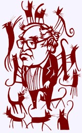 Como todos sabemos que es punzante y taimado, su tartufería se transforma en una suerte de cordial virtuosismo que ejerce relamiéndose como el gato de Cheshire, ése que sonreía sin parar a la incauta Alicia enseñando sus dientes en la oscuridad del país de las maravillas. Que el rostro de Monsiváis es cada vez más felino, sus carcajadas más próximas al maullido, lo comprobamos quienes lo seguimos desde hace cuarenta y tres años y vemos cómo se blanquean prematuramente sus cabellos y se afilan sus uñas. A medida que pasa el tiempo Monsiváis se parece cada vez más a sus gatos: Rosa Luz Emburgo, Ansia de militancia, Eva Sión, Fetiche de peluche y Fray Gatolomé de las Bardas, Chocorrol.