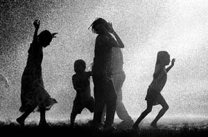 En un albergue para damnificados por el terremoto, los niños juegan con el rocío que es esparcido por pipas de agua para evitar que se levante el polvo. Ante las quejas de la población por la lentitud en la ayuda, dos firmas extranjeras supervisarán que el auxilio internacional no se desvíe FOTO AP