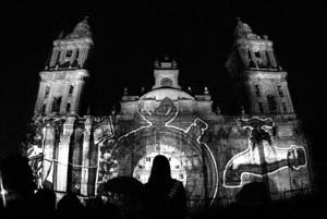 El frontispicio de la Catedral Metropolitana se llenó de luz e imágenes con la conjunción de arte pictórico, fondo musical y mágicos castillos artesanales FOTO FRANCISCO OLVERA