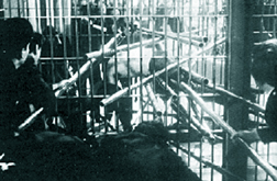 los prisioneros apandados sacan la cabeza por el postigo de la puerta de