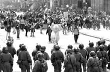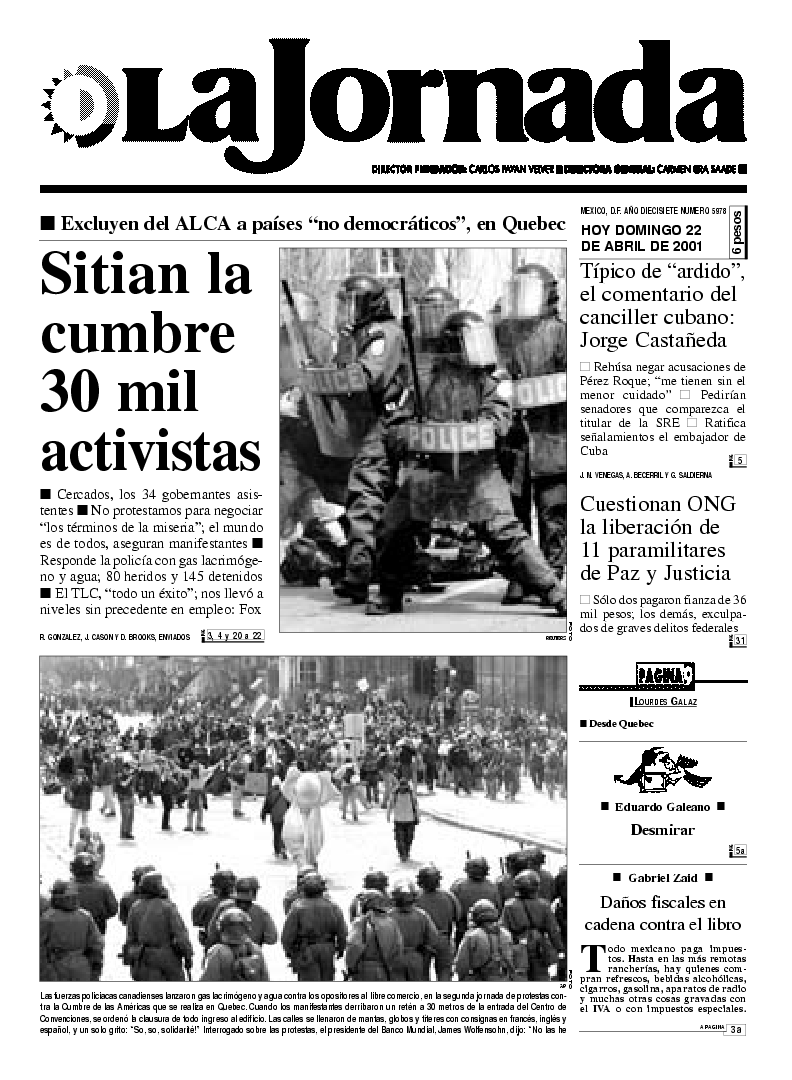 Las fuerzas policiacas canadienses lanzaron gas lacrimógeno y agua contra los opositores al libre comercio, en la segunda jornada de protestas contra la Cumbre de las Américas que se realiza en Quebec. Cuando los manifestantes derribaron un retén a 30 metros de la entrada del Centro de Convenciones, se ordenó la clausura de todo ingreso al edificio. Las calles se llenaron de mantas, globos y títeres con consignas en francés, inglés y español, y un solo grito: ``So, so, solidarité!'' Interrogado sobre las protestas, el presidente del Banco Mundial, James Wolfensohn, dijo: ``No las he visto'' FOTOS REUTERS y AP