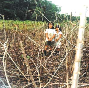 Niñas campesinas en un plantío muerto de yuca.