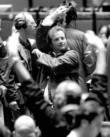 La mayoría de los mercados de Europa, Asia y Latinoamérica reportaron pérdidas ante los riesgos de que Argentina se declare en moratoria. En México, la bolsa retrocedió 2.2% y el dólar al mayoreo se cotizó en 9.25 pesos. En la imagen, retorno del legendario corredor Tom Baldwin al mercado de futuros de Chicago FOTO REUTERS