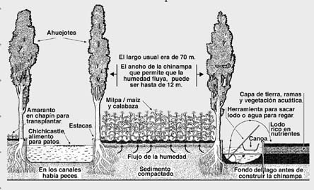 La disponibilidad de agua se logró manteniendo siempre húmedo el suelo; la fertilidad se obtuvo por medio de la recuperación de lodos con alto contenido de materia orgánica y nutrientes, que forman la parte superior de la chinampa.