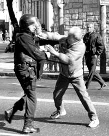 El Senado aprobó el proyecto para lograr déficit cero en la economía, que incluye medidas como recortar 13 por ciento a salarios y jubilaciones. En la imagen, la policía reprime a un anciano que participaba en una marcha contra la privatización de una empresa eléctrica. En la provincia de Santa Fe hubo un muerto, varios heridos y 14 detenidos tras el enfrentamiento entre dueños del autotransporte y choferes, por la ola de despidos FOTO REUTERS