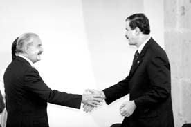 Vicente Fox felicita a Carlos Fuentes al término del discurso en que