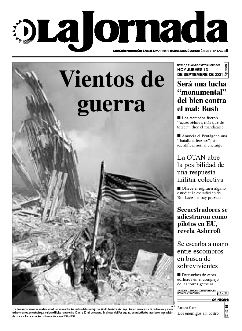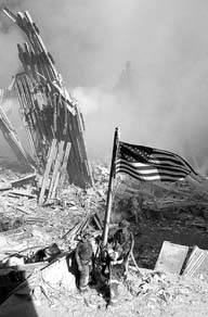 Los bomberos izaron la bandera estadunidense entre los restos del complejo del World Trade Center. Ayer fueron rescatados 82 cadáveres y nueve sobrevivientes; se calcula que en los edificios había entre 10 mil y 20 mil personas. En el caso del Pentágono, las autoridades mantienen la previsión de que la cifra de muertos podría oscilar entre 100 y 800 FOTO AP