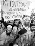 ``Cuidado, estadunidenses, los mujaidines (guerreros islámicos) están en camino'', se lee en la pancarta que activistas pro tailbán desplegaron junto con fotos de Osama Bin Laden durante un acto en Karachi, Pakistán. En tanto, el buque Enterprise, parte de la flota de Pacífico, recibió la orden de permanecer indefinidamente en aguas internacionales luego de que había sido llamado de regreso. El realineamiento continúa pero la Marina de Estados Unidos no reveló la localización de las naves en la imagen FOTOS AP