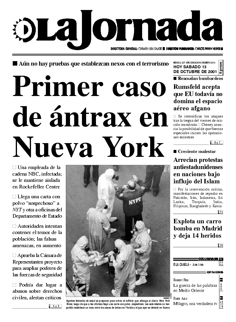 Llega una carta con polvo ``sospechoso'' a NYT y otra a oficinas del Departamento de Estado