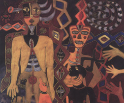 Percibo las pinturas de Karima Muyaes como una gran orquesta polifónica en la que se suceden, simultáneamente, un sinfín de sonidos armoniosos en su conjunto. Lo que a primera vista pudiera parecer caótico y disperso, tiene, en realidad, una lógica y un orden internos. Así se aprecia en su exposición Rituales que se presenta en la Casa Lamm. Karima observa con atención y asombro las coincidencias que existen en las manifestaciones rituales de culturas o grupos étnicos antípodas. ¿Cómo equiparar a los maoris de Nueva Zelanda con los yaquis de Sonora? ¿A los sofisticados nativos de Gabón con nuestros indios seris? En suma, ¿cómo interpretar los entrecruzamientos culturales de los aborígenes de continentes y razas disímbolos? Un enigmático hilo invisible hilvana las expresiones auténticas de los pueblos de toda el orbe, reflejadas en sus rituales y en su arte popular. ¿Cómo explicar la semejanza entre los delicados mosaicos de chaquira de los huicholes y los elaborados por los nativos de Vanuatu (Oceanía)? ¿O los finísimos bordados e ikats de Chang Mai (Tailandia) en relación con los de Guatemala? Todas las culturas mal llamadas "primitivas", cualesquiera que sean sus orígenes, doctrinas y creencias, coinciden, de una u otra forma, en sus ritos propiciatorios de las cosechas, en sus ceremonias de iniciación y cultos funerarios, en sus alegorías a la fertilidad y en sus alabanzas al cosmos y a la naturaleza. Por ende, algunas manifestaciones artísticas y religiosas denotan ciertas similitudes. Aunque hoy cuesta trabajo entenderlo, en esta moderna época tecnócrata perviven grupos étnicos que aún veneran a los elementos irracionales del universo e invocan el poder de las fuerzas mágicas.