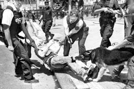balas de goma, los gases lacrimógenos y los chorros de agua; en el