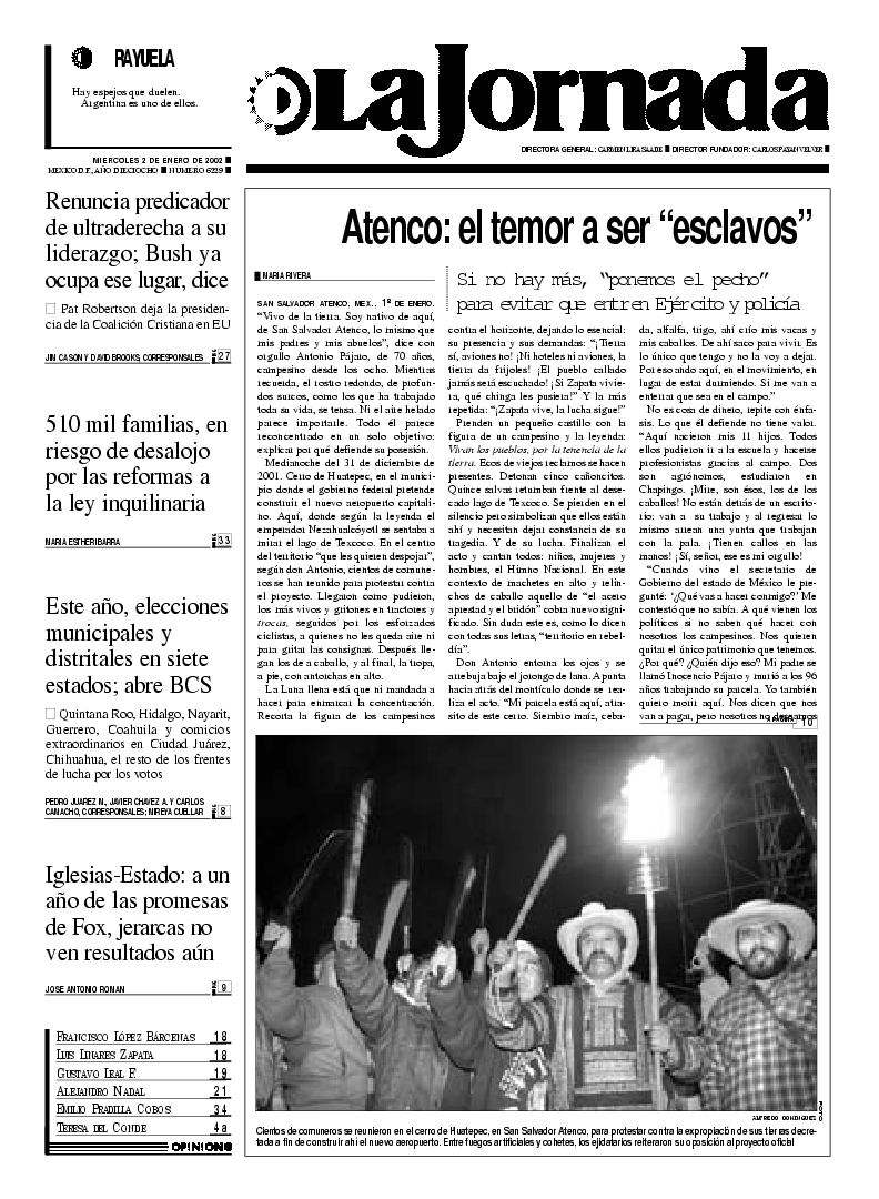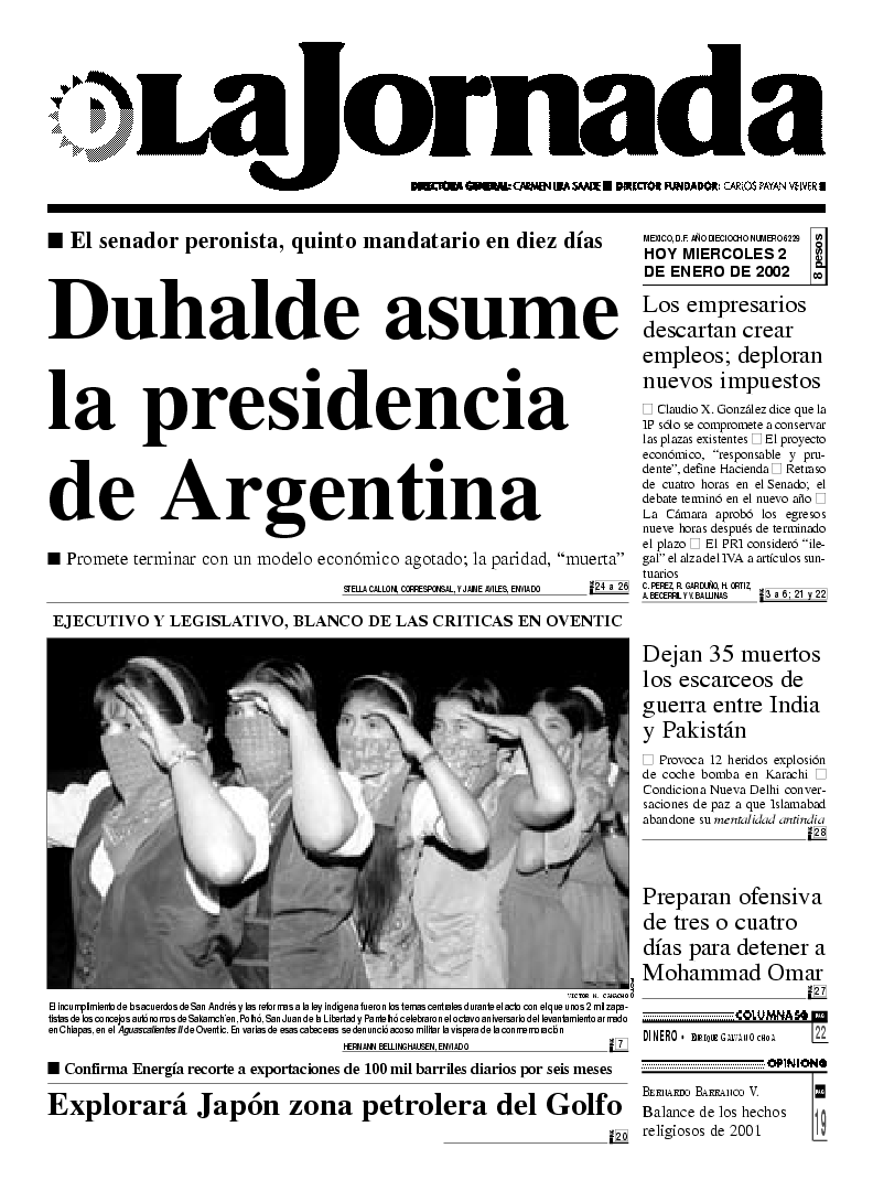 El incumplimiento de los acuerdos de San Andrés y las reformas a la ley indígena fueron los temas centrales durante el acto con el que unos 2 mil zapatistas de los concejos autónomos de Sakamch'en, Polhó, San Juan de la Libertad y Pantelhó celebraron el octavo aniversario del levantamiento armado en Chiapas, en el Aguascalientes II de Oventic. En varias de esas cabeceras se denunció acoso militar la víspera de la conmemoración VICTOR M. CAMACHO