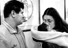Oscar Alonso Carrillo y Verónica Flores Sánchez recibieron ayer en instalaciones de la Procuraduría General de Justicial del Distrito Federal a la pequeña Aixel Camila tras corroborarse, mediante exámenes de ADN, que la bebé era su hija. La pequeña fue localizada el jueves en el municipio mexiquense de Villa Nicolás Romero tras ser secuestrada hace un mes del Hospital General de la Villa por una mujer disfrazada de enfermera FOTO MARCO PELAEZ