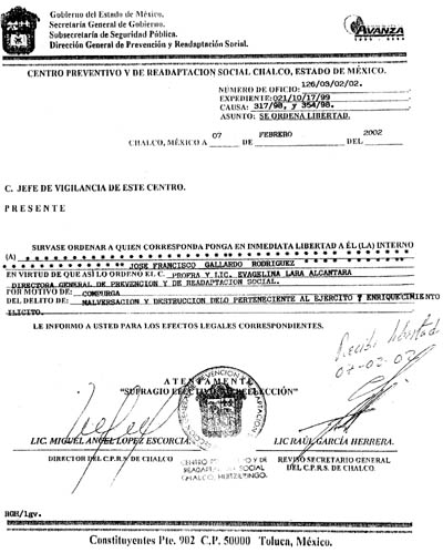 ORDEN DE LIBERACION DEL GENERAL GALLARDO