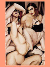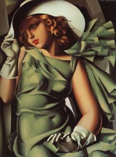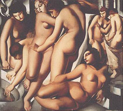 La hermana de Tamara vio un día los magullones que le había hecho el marido y le aconsejó: "Tienes que trabajar." Y después, recordando las habilidades para el dibujo que desde niña Tamara tenía, le aconsejó que tomara clases en una escuela de arte: vendiendo cuadros podría mantenerse y mantener a la familia. Tamara lo hizo, y lo hizo tan en serio, que a los tres años ya estaba exponiendo en conocidas galerías y vendiendo retratos a los ricos de París. Hizo unos retratos mágicos: mostraba a la gente cómo era por dentro y por fuera. Su aprendizaje fue vertiginoso. Alumna en primer término de Maurice Denis, lo despreció más tarde por ser éste un secuaz de Cézanne, al cual la pintora despreciaba, por borroso y confuso. Admiradora de la luz, de la pincelada perfecta, de todo aquello que le había llenado los ojos en varios viajes a Florencia y Roma, se desligó fácilmente de las teorías de su maestro. Tamara despreció en general todas las teorías, porque quería demostrar a todo el mundo que ella se había hecho a sí misma, que todo, todo incluso esa maestría que irradian sus cuadros lo había conseguido con el trabajo y la voluntad. Nunca reconoció influencias de sus contemporáneos, aunque varios lazos estéticos la unen a André Lhote, quien también fue su maestro. Lhote, por un lado, la empapó de la belleza de los desnudos de Ingres y, por otro, defendió en la cabeza de Tamara el cubismo como un retorno al clasicismo. Pero mucho más que las escuelas formales de arte, los años veinte de París fueron fundamentales en la formación de Tamara a través de lo que vulgarmente se entiende por "escuela de la vida". En estos años, aunque pintaba frenéticamente por las noches con la nariz llena de cocaína, Tamara respetaba las reglas del juego de la vida de los artistas y concurría a los cafés. Los cafés estaban llenos de debates estéticos y de chismorreos: verse, observarse, criticarse, era fundamental en ese amasijo humano y artístico donde florecieron no sólo las vanguardias sino también el concepto de la galería, de arte como mercancía, de objeto artístico plausible de ser vendido e intercambiado. La mujer nueva En los cafés conoció por ejemplo al líder del futurismo, Marinetti, de quien probablemente fue amante. Cuenta el anecdotario que una noche, Marinetti incitó a los contertulios de una mesa a quemar el Louvre: Tamara estaba allí y ofreció llevarlos en su auto. Cuando fueron a buscar el auto, éste no estaba: se lo habían llevado por mal estacionado. El Louvre siguió vivo.