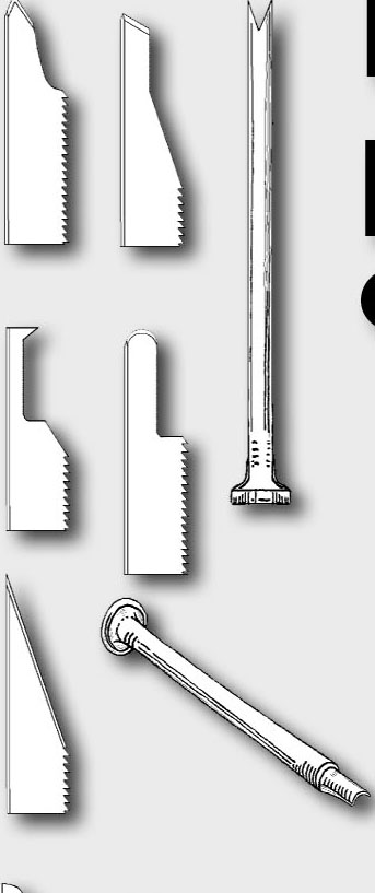 Las navajas, cinceles, escoplos curvos y punzones miniatura sirven para labrar escaleras, pórticos y techados y para excavar ventanas y puertas.