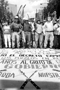 Ejidatarios de San Salvador Atenco y Texcoco se manifestaron por Paseo de la Reforma en su camino a Los Pinos. Los campesinos invitaron a Vicente Fox a un ``debate abierto'' sobre la expropiación de 5 mil hectáreas para el nuevo aeropuerto FOTO FRANCISCO OLVERA