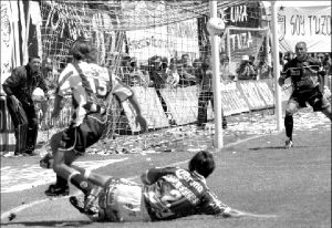 no pudo despejar, ya que Hugo Brizuela conectó con la cabeza y el