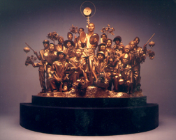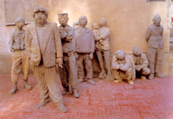 trabajadores en una pose revolucionaria, reminiscencia de la estatua de