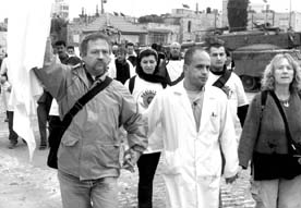 El francés José Bové (izquierda, con la manta) encabezó con medio centenar de pacifistas una marcha en los alrededores del cuartel de Yasser Arafat, en Ramallah. El activista fue detenido junto con 15 personas tras romper el cerco del ejército israelí y sostener una reunión con el presidente de la ANP. Alrededor de 40 extranjeros permanecieron con el líder palestino formando una especie de escudo humano para protegerlo FOTO AFP