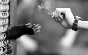 Un chimpancé recibe una flor de un visitante del