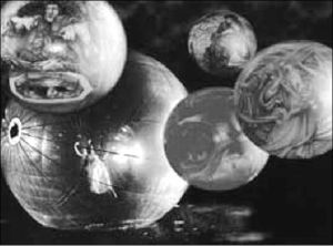 Santafe de Bogota, 1º de abril. Media docena de ángeles flotaron anoche en la Plaza Simón Bolívar y danzaron, ingrávidos, sobre la fachada de la catedral en un espectáculo de luces, sonidos, poesía y juegos pirotécnicos que dio marco a los desplazamientos de dos enormes esferas de plástico transparente, las cuales rodaban por entre la gente, y de tres globos gigantescos semejantes a planetas en órbita teñidos de imágenes barrocas y renacentistas, entre ellas una de Boticcelli.