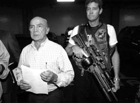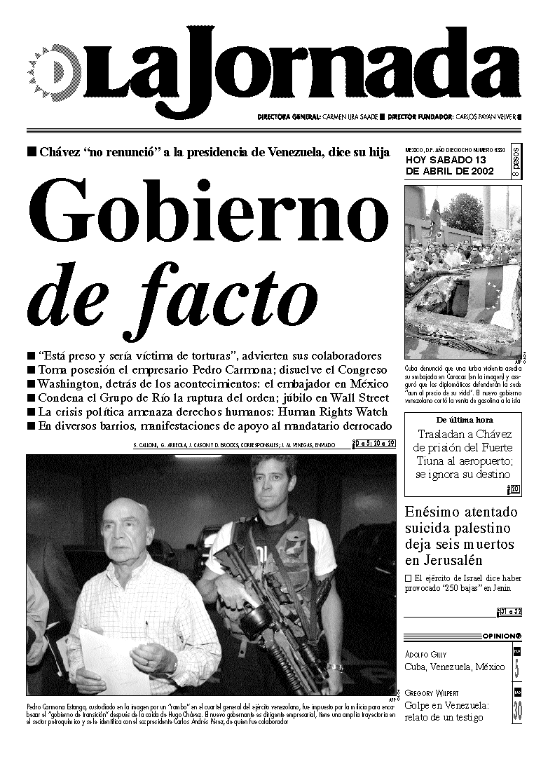 Pedro Carmona Estanga, custodiado en la imagen por un ``rambo'' en el cuartel general del ejército venezolano, fue impuesto por la milicia para encabezar el ``gobierno de transición'' después de la caída de Hugo Chávez. El nuevo gobernante es dirigente empresarial, tiene una amplia trayectoria en el sector petroquímico y se le identifica con el ex presidente Carlos Andrés Pérez, de quien fue colaborador FOTO AFP