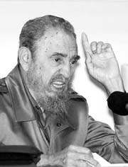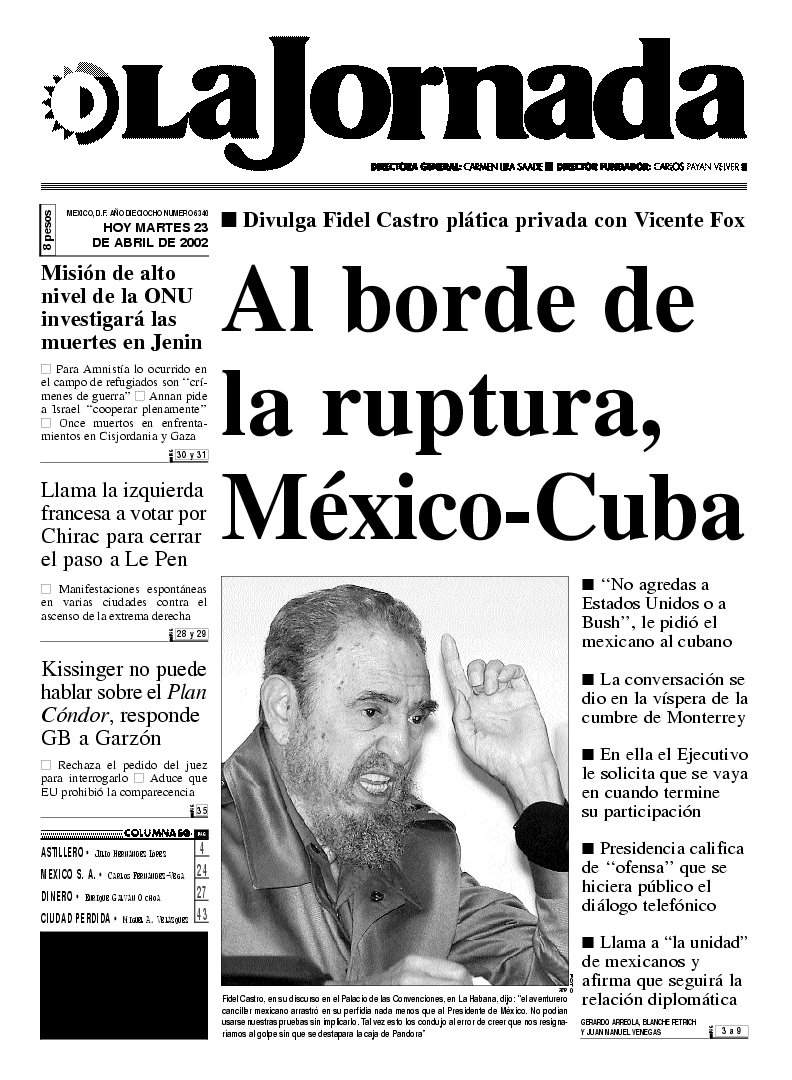 Fidel Castro, en su discurso en el Palacio de las Convenciones, en La Habana, dijo: ``el aventurero canciller mexicano arrastró en su perfidia nada menos que al Presidente de México. No podían usarse nuestras pruebas sin implicarlo. Tal vez esto los condujo al error de creer que nos resigna-ríamos al golpe sin que se destapara la caja de Pandora'' FOTO AFP