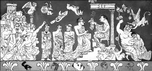 Otro telón de Gómez Rosas, La tragedia griega, ironiza la entrega del premio de Artes Plásticas, que José Clemente Orozco recibe, como si fuera de la lotería, de manos del secretario de Educación Pública, Jaime Torres Bodet. El crítico de arte Justino Fernández lleva la cola de la toga a Orozco. Detrás del podio Diego Rivera, enojado, consuela a una llorosa Frida Kahlo, no obstante que su segundo lugar le haya proporcionado una bolsa de 5 mil pesos, que sujeta en su mano izquierda. Muy ufano está el jurado integrado por el Dr. Atl, Julio Castellanos y Francisco Goitia. En el otro extremo David Alfaro Siqueiros, con atuendo guerrero, arenga a los demás perdedores. Encima del conjunto revolotean los símbolos griegos de la ira y la envidia.