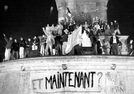 Una pancarta con esa pregunta fue desplegada por decenas de militantes de izquierda que se reunieron en la plaza de La Bastilla para celebrar la derrota de Jean Marie Le Pen. Líderes del Partido Comunista, de la Liga Comunista Revolucionaria y de Los Verdes prometieron manifestaciones diarias para cobrar su voto a favor de Jacques Chirac y obligarlo a mantener la política social del vencido primer ministro Lionel Jospin FOTO AFP