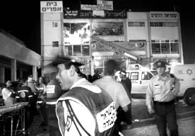Rescatistas frente al inmueble que albergaba un club de billar en la localidad de Rishon Letzion, al sur de Tel Aviv, donde un palestino hizo detonar una maleta cargada con explosivos. El estallido colapsó parte del edificio y gran número de personas quedaron atrapadas. El ataque fue reivindicado por las Brigadas Ezzedin al Qassam, brazo armado del Movimiento de Resistencia Hamas FOTO Reuters
