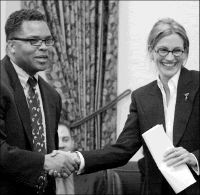 La actriz Julia Roberts estrecha la mano del congresista Jesse Jackson Jr. luego de que ayer testificó en la Cámara de Representantes en favor de otorgar más recursos para la investigación del denominado síndrome de Rett, que afecta principalmente a los niños FOTO REUTERS