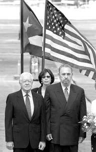Con las banderas de Cuba y Estados Unidos como fondo, Fidel Castro recibió en La Habana con todos los honores al ex presidente Jimmy Carter. Es la primera visita de un mandatario de Estados Unidos -activo o en retiro- a la isla desde 1928 FOTO REUTERS
