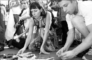 Entre música y baile, enarbolando pancartas y brazaletes con los letreros de "paz", así como carteles en los que piden tolerancia y recurrentes críticas a los actos represivos cometidos por la Procuraduría General de la República (PGR) y la Dirección de Seguridad Pública de Jalisco (DSPJ) el sábado 4 de mayo en Tlajomulco de Zúñiga, transcurrieron las horas sin que aparecieran las drogas o el alcohol.