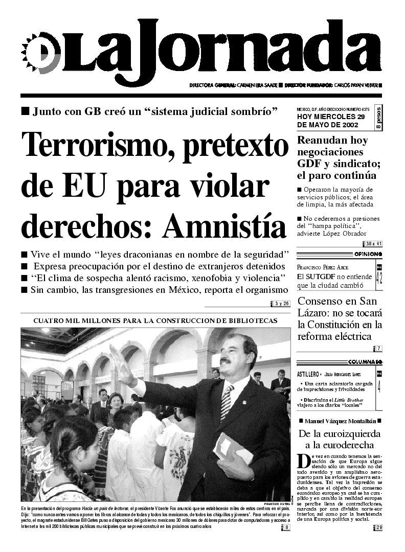 En la presentación del programa Hacia un país de lectores, el presidente Vicente Fox anunció que se establecerán miles de estos centros en el país. Dijo: ``como nunca antes vamos a poner los libros al alcance de todas y todos los mexicanos, de todos los chiquillos y jóvenes''. Para reforzar el proyecto, el magnate estadunidense Bill Gates puso a disposición del gobierno mexicano 30 millones de dólares para dotar de computadoras y acceso a Internet a las mil 200 bibliotecas públicas municipales que se prevé construir en los próximos cuatro años FOTO FRANCISCO OLVERA