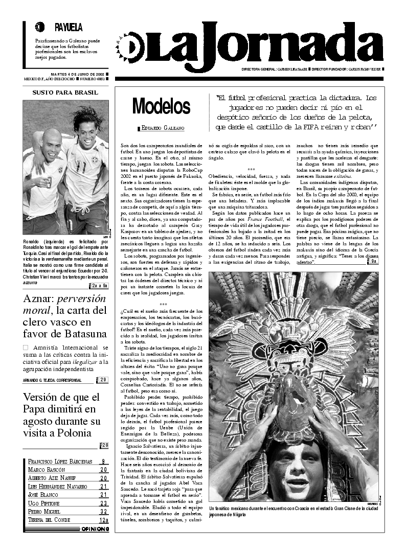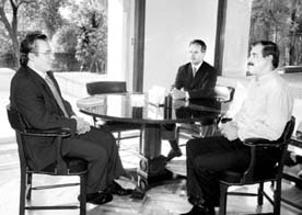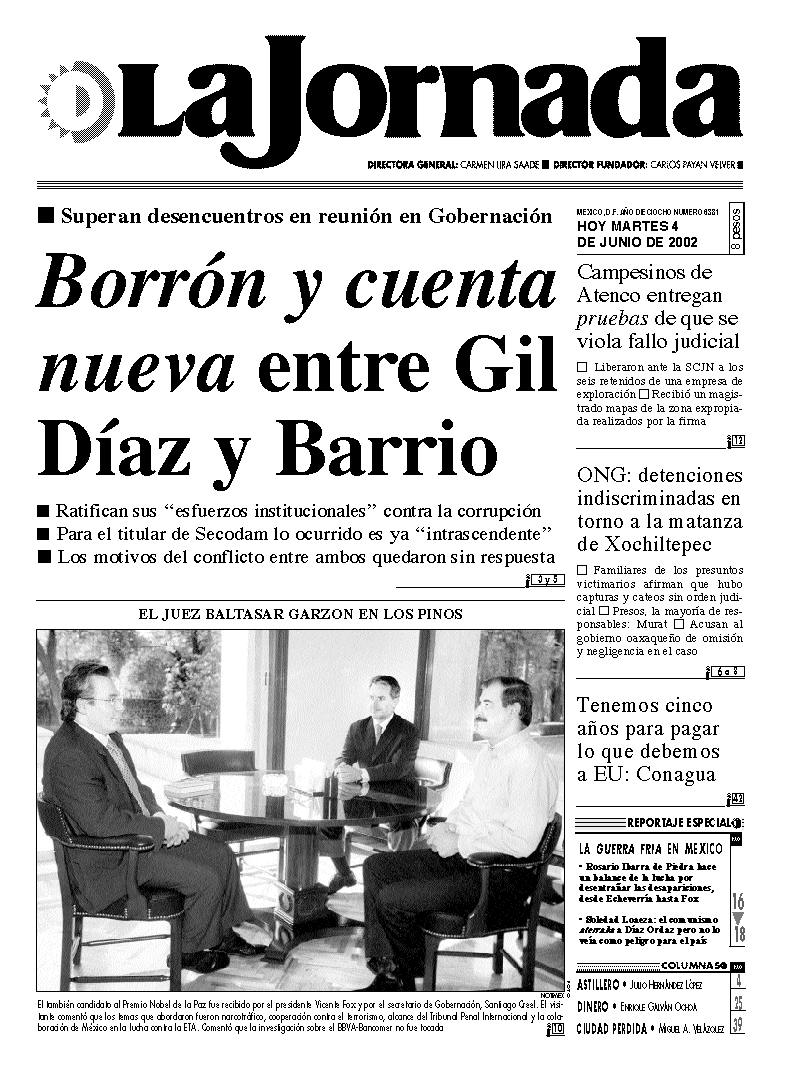 El también candidato al Premio Nobel de la Paz fue recibido por el presidente Vicente Fox y por el secretario de Gobernación, Santiago Creel. El visitante comentó que los temas que abordaron fueron narcotráfico, cooperación contra el terrorismo, alcance del Tribunal Penal Internacional y la colaboración de México en la lucha contra la ETA. Comentó que la investigación sobre el BBVA-Bancomer no fue tocada FOTO NOTIMEX