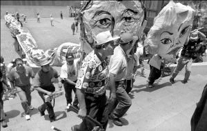 portando carteles con fotografías del presidente Vicente Fox, del