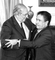 Un frío y distante Eduardo Duhalde abraza a su colega uruguayo Jorge Batlle en la breve ceremonia de reconciliación realizada en la residencia de Olivos, en Buenos Aires FOTO AFP
